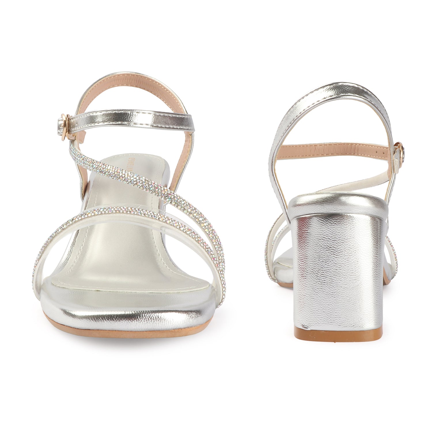 Step into refined glamour with these block heel sandals, designed to elevate your evening and occasion wear effortlessly. Featuring sleek metallic straps paired with delicate crystal-embellished detailing, this pair offers the perfect balance of sparkle and sophistication.