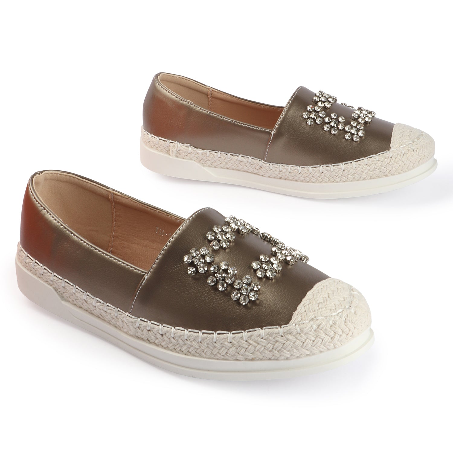 Add a touch of glamour to your everyday wardrobe with these premium espadrille loafers. Designed with a smooth metallic-finish upper, this elegant pair is highlighted by sparkling crystal embellishments that elevate its luxe appeal. The handcrafted jute-wrapped sole offers a refined artisanal look, while the cushioned insole ensures all-day comfort.