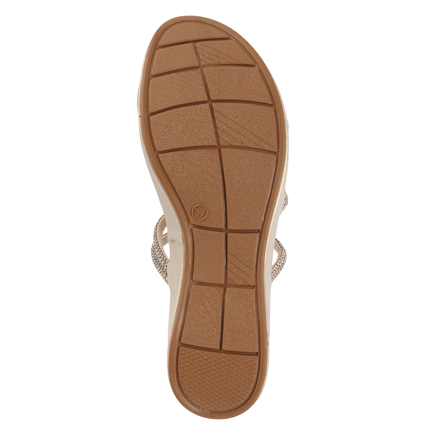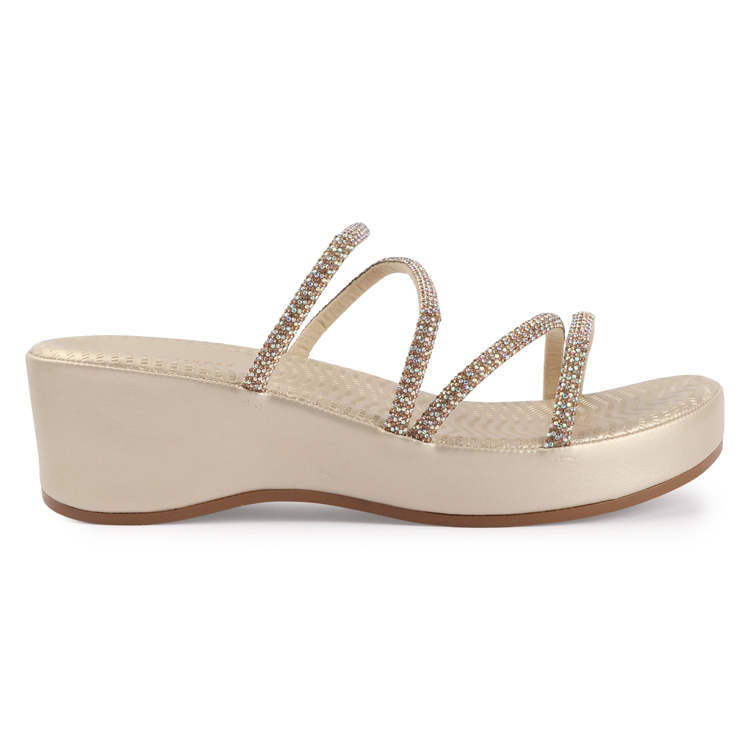 Add subtle glamour to your everyday and festive wardrobe with these crystal strap wedge sandals. Designed with delicately embellished straps and a softly cushioned footbed, this pair offers a perfect balance of elegance and comfort. The lightweight wedge sole provides effortless height and stability, making them ideal for long hours at celebrations, brunches, or evening outings.
