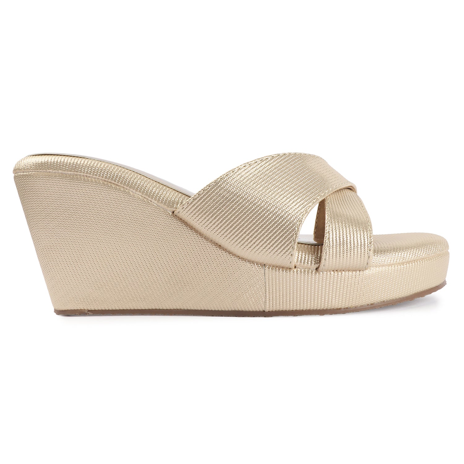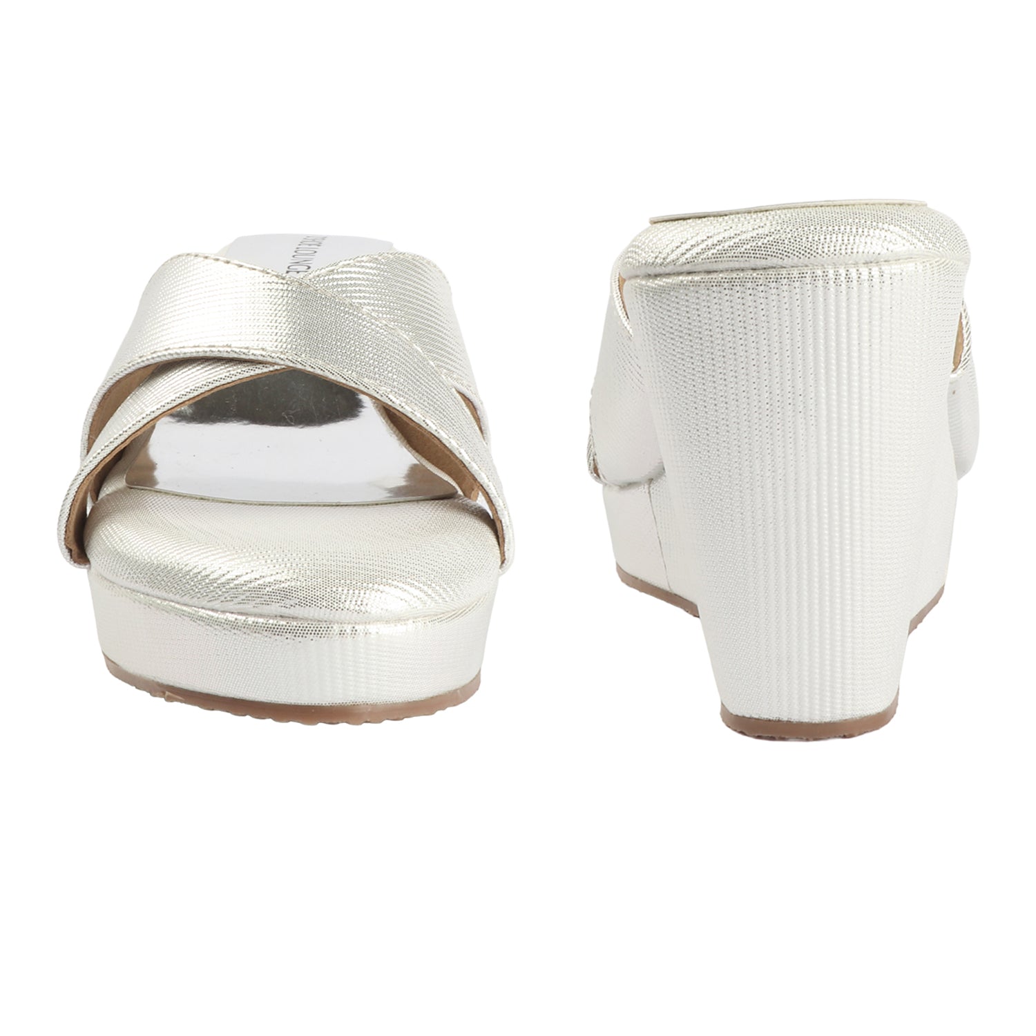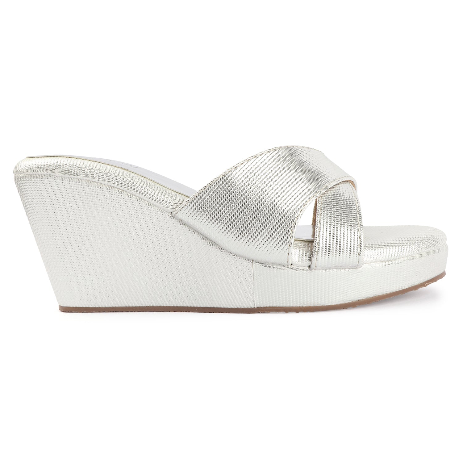 Add a touch of modern glamour to your festive wardrobe with these silver cross-strap wedge sandals. Designed with a sleek metallic texture and a flattering platform wedge, this pair offers the perfect balance of style and comfort. The cushioned insole and stable heel make it ideal for long celebrations, from weddings to evening parties. Pair it effortlessly with sarees, lehengas, gowns, or Indo-western outfits for a refined, elegant look.