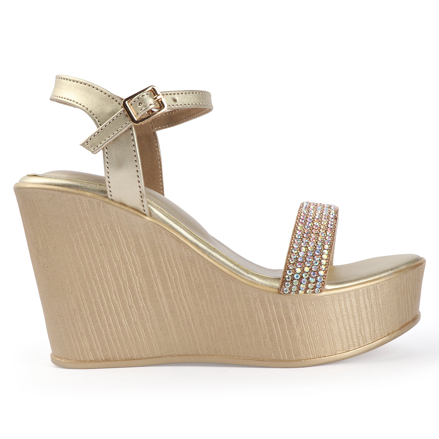 Step into elevated glamour with these luxury gold embellished wedge heels from DShoeLounge. Designed with a sparkling rhinestone-encrusted front strap and a sleek ankle buckle closure, this pair delivers the perfect balance of height, comfort, and elegance.