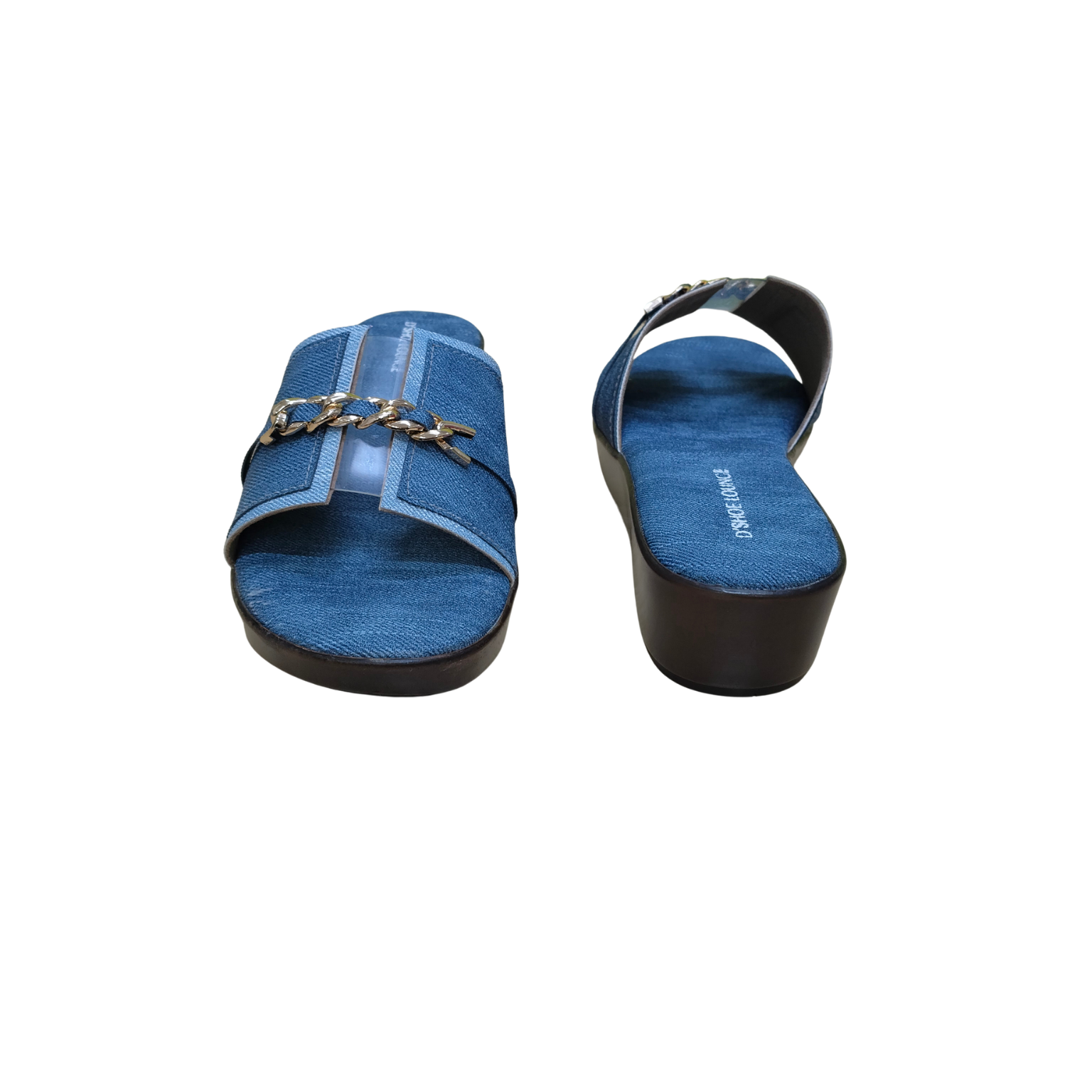 Crafted from premium, deep-wash denim and crowned with a statement oversized gold chain link, this wedge offers a bold, contemporary edge to your curated wardrobe. Engineered for the dynamic pace of cosmopolitan life, the seamless dark-toned platform silhouette provides an authoritative lift while the signature high-density footbed ensures you glide from a high-powered luncheon to an evening soirée with uncompromised ease. Whether paired with tailored white linens, luxury fusion wear, or a statement silk saree, these wedges serve as a testament to your quiet confidence and artisanal taste.