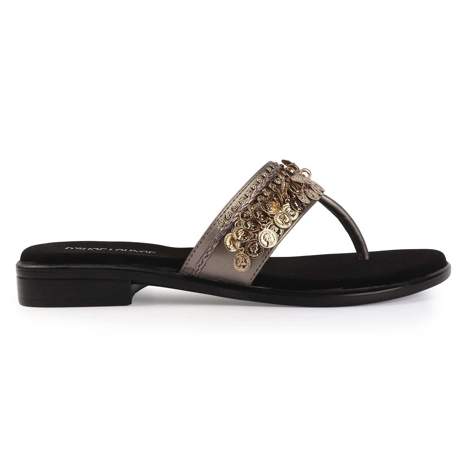 Inspired by traditional jewellery accents, these gold coin embellished flat toe-ring sandals from DShoeLounge bring festive elegance to everyday comfort. The ornate strap is adorned with delicate coin detailing, creating a rich ethnic look that pairs beautifully with Indian silhouettes.