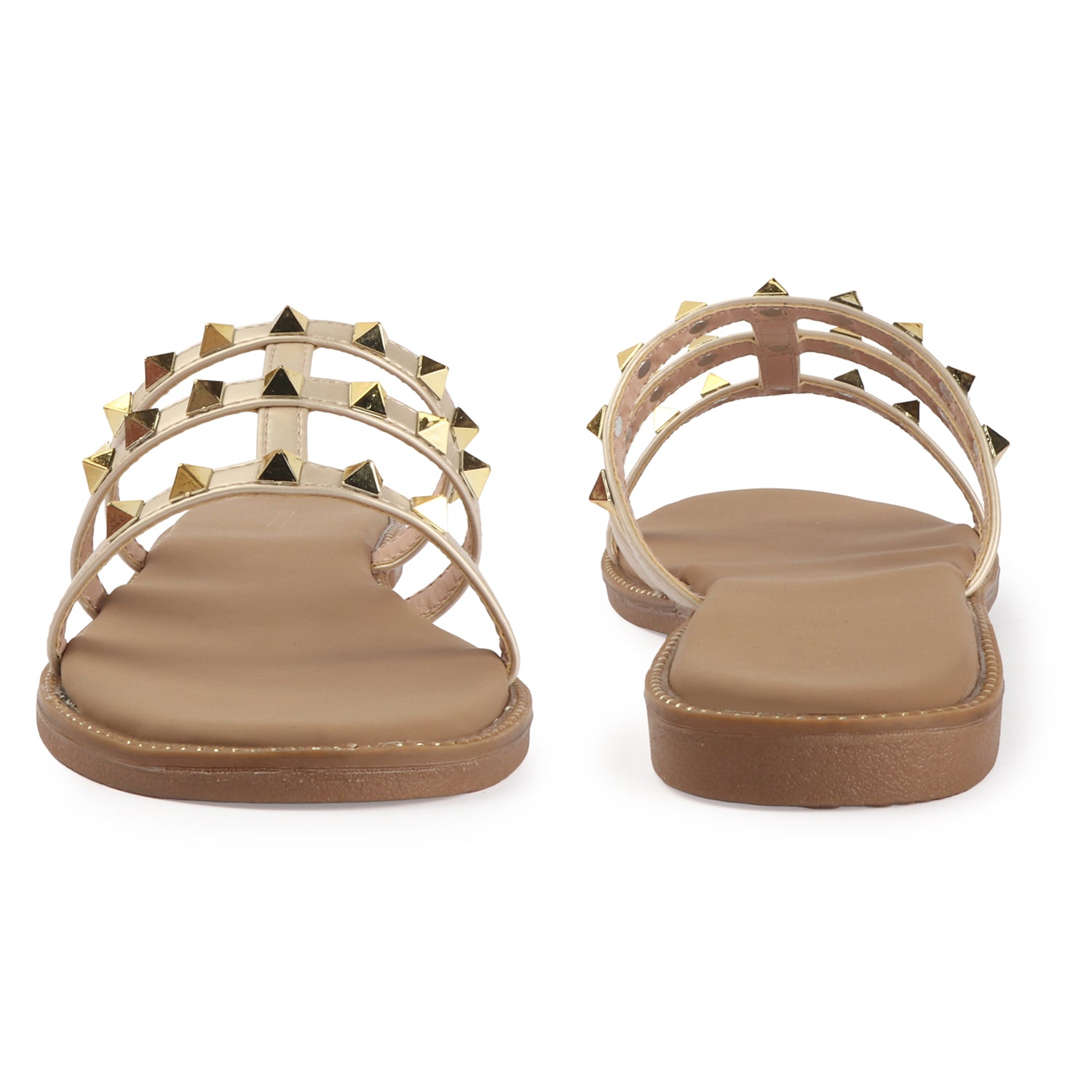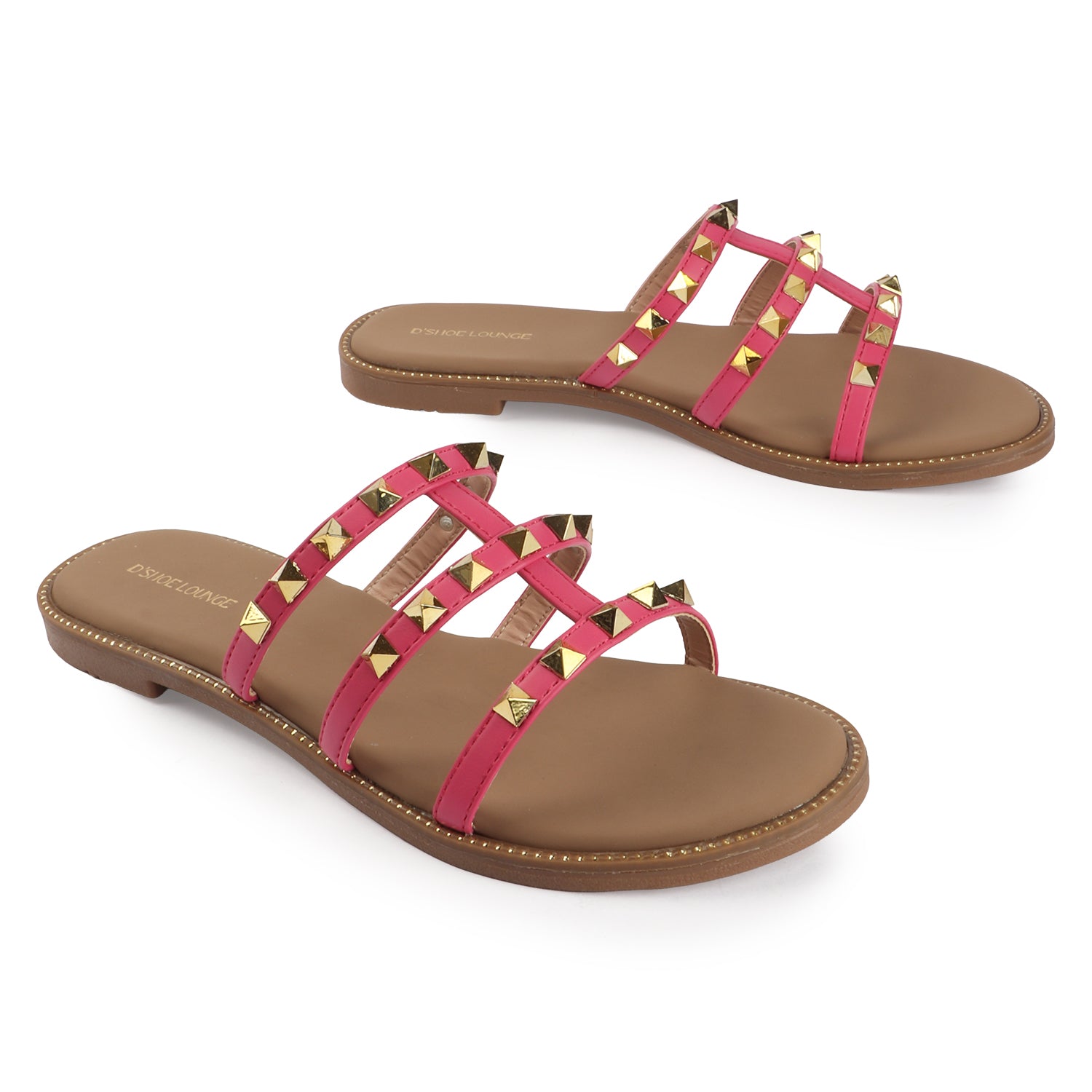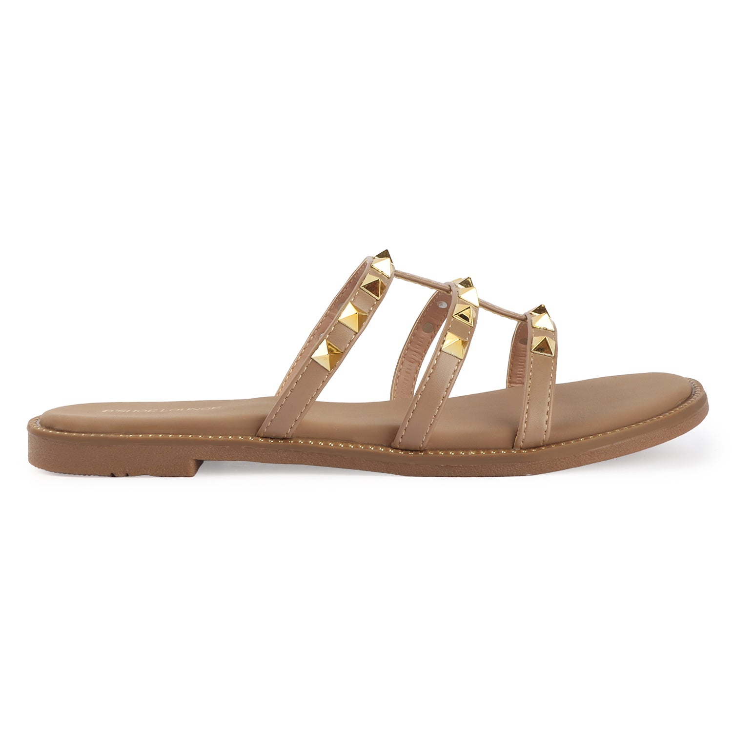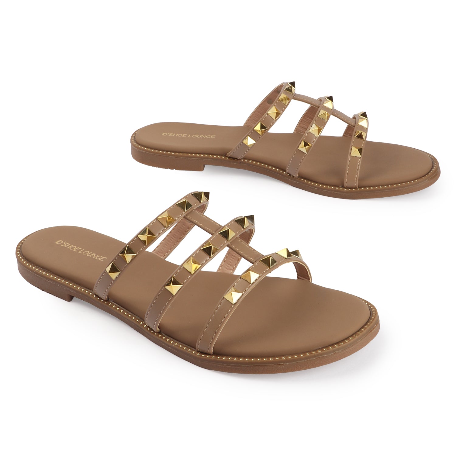 Refined, versatile, and effortlessly stylish, these studded flats are designed for women who love understated luxury. Featuring sleek multi-strap detailing adorned with gold pyramid studs, this pair adds a modern edge while remaining timeless.
