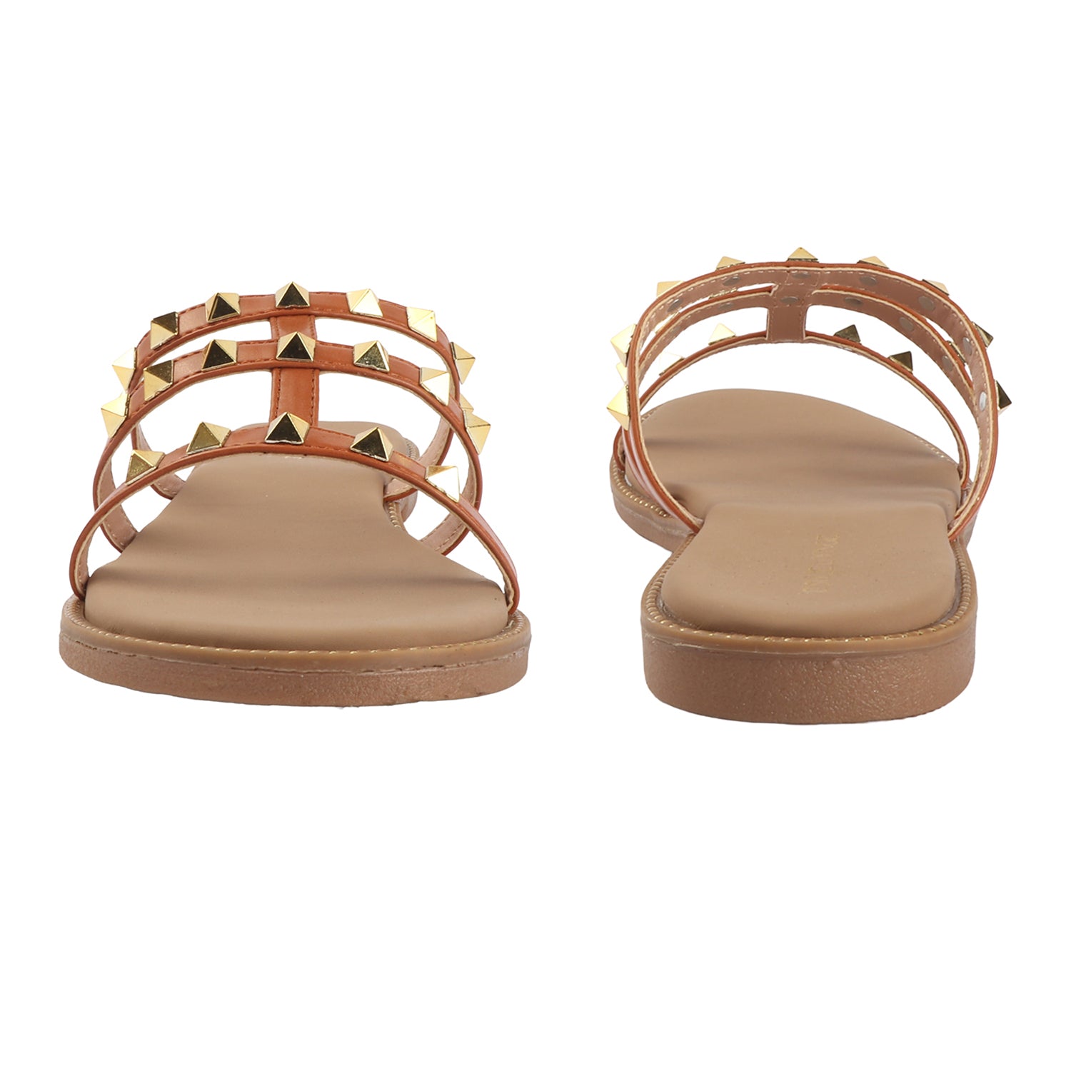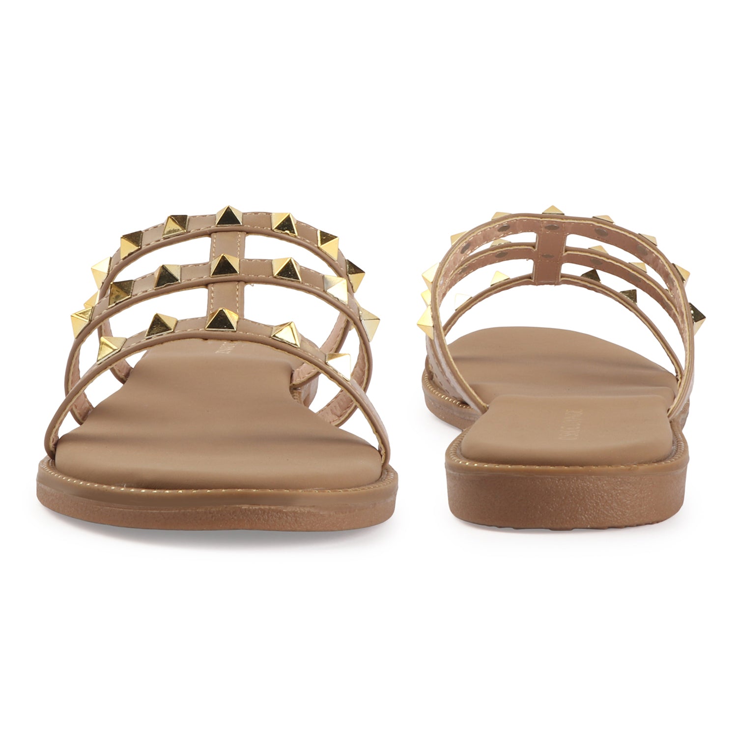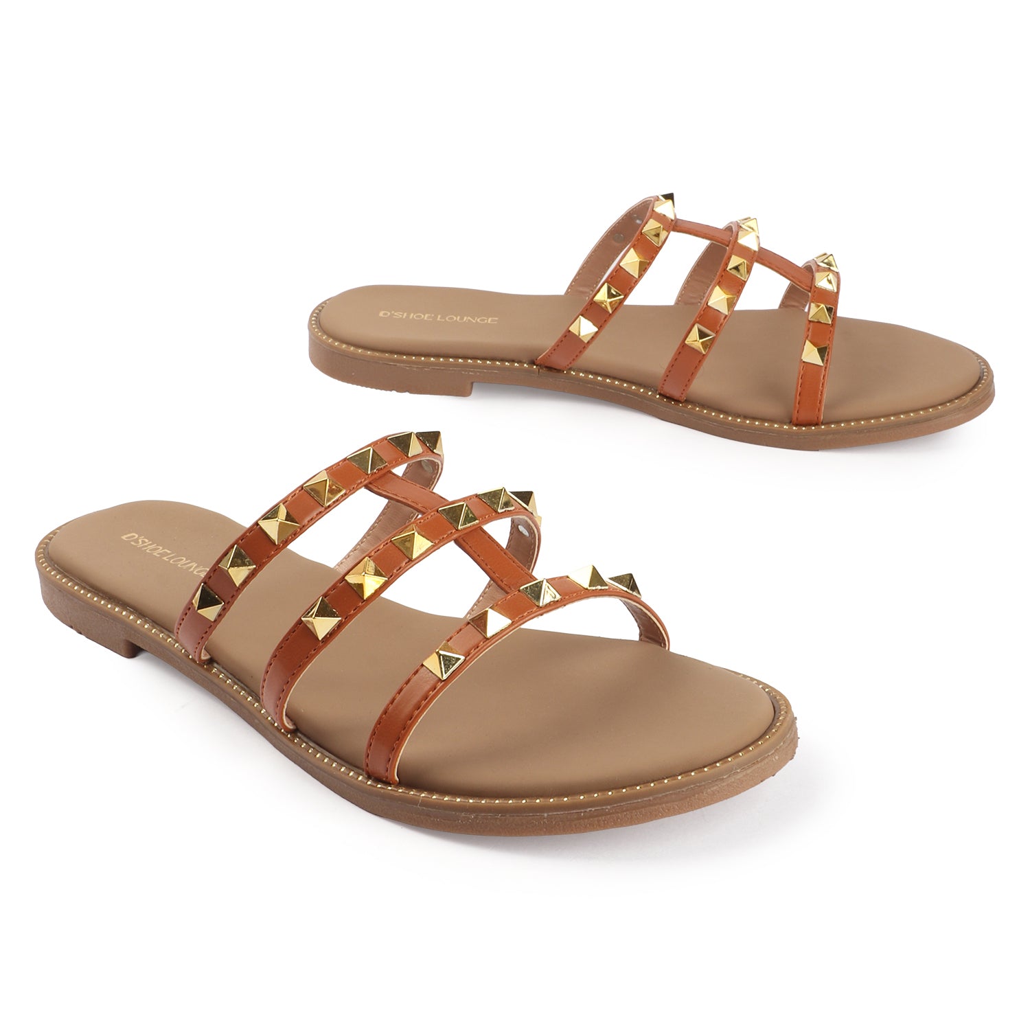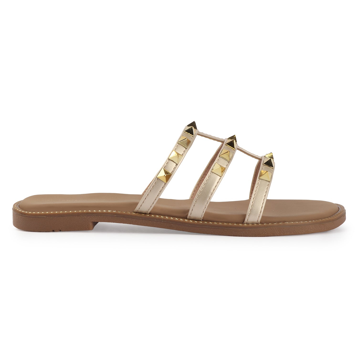 Refined, versatile, and effortlessly stylish, these studded flats are designed for women who love understated luxury. Featuring sleek multi-strap detailing adorned with gold pyramid studs, this pair adds a modern edge while remaining timeless.